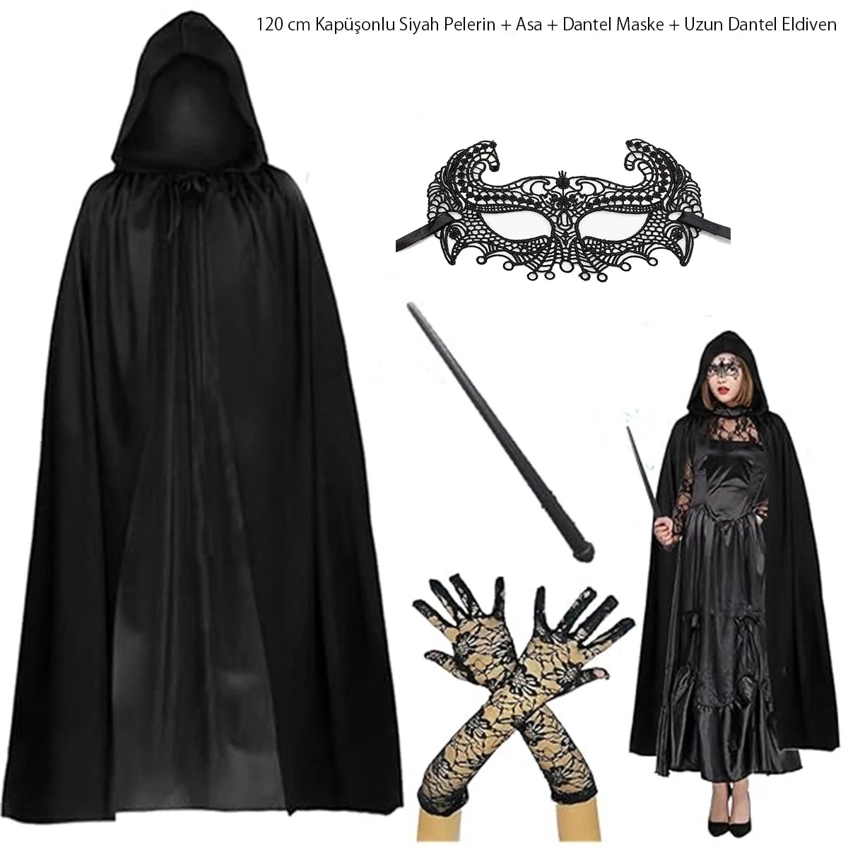 120 Cm Kapüşonlu Siyah Pelerin + Asa + Dantel Maske + Uzun Dantel Siyah Eldiven Kostüm Seti