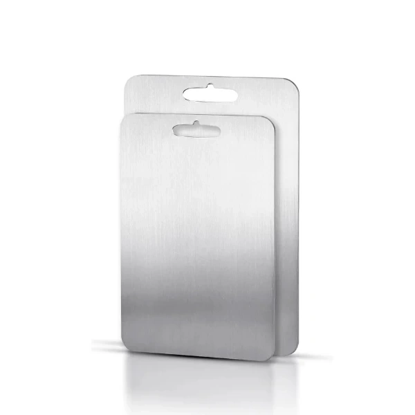 2'Lİ PASLANMAZ ÇELİK KESİM PANOSU SETİÜrün Özellikleri2’li paslanmaz çelik kesim panosu seti, mutfakta hijyenik ve uzun ömürlü kullanım için özel olarak tasarlanmıştır. 18/10 304 kalite paslanmaz çelikten üretilmiş olan bu panolar, gıda için en uygun ve sağlıklı çelikten üretilmiştir, çift taraf skoçlu yüzeyleri sayesinde her iki yüzeyi de kesim için kullanıma uygundur. 0.90 mm kalınlığıyla sağlam ve dayanıklıdır, kolay kolay deformasyon göstermez. Antibakteriyel yapısı sayesinde gıda güvenliğini destekler ve yüzeyi leke tutmaz. Büyük boy 33x23 cm, küçük boy ise 28x20 cm ölçülerindedir. Kırılmaz yapısı ve sağlıklı kullanım özelliği ile mutfakta güvenli bir çözüm sunar. Elde ya da bulaşık makinesinde kolayca yıkanabilir.Paket İçeriği1 adet büyük boy paslanmaz çelik kesim panosu (33x23 cm)1 adet küçük boy paslanmaz çelik kesim panosu (28x20 cm)