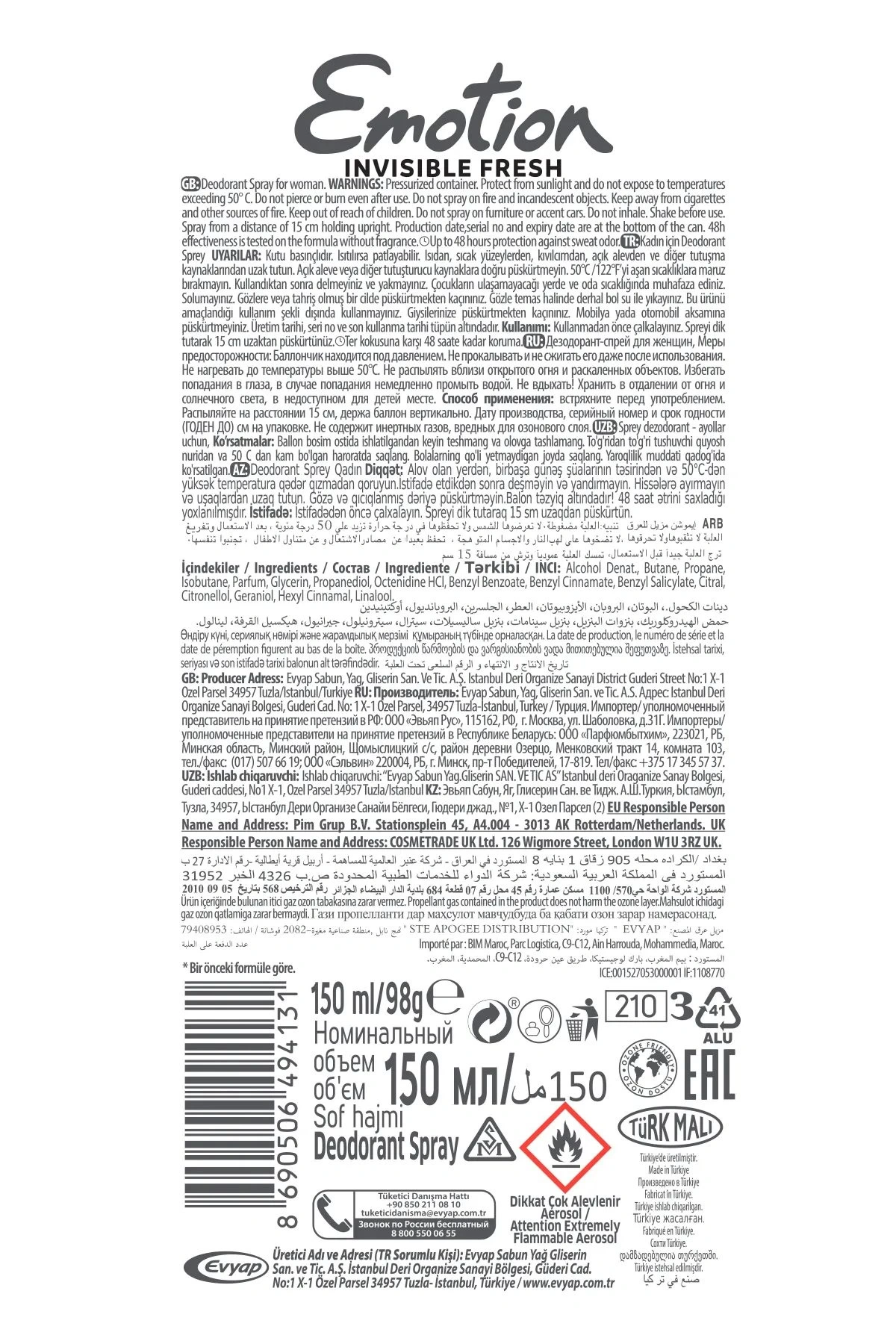 3 Adet Emotion Invisible Fresh Black & White Kadın Deodorant 150ml Vegan, Leke Bırakmaz