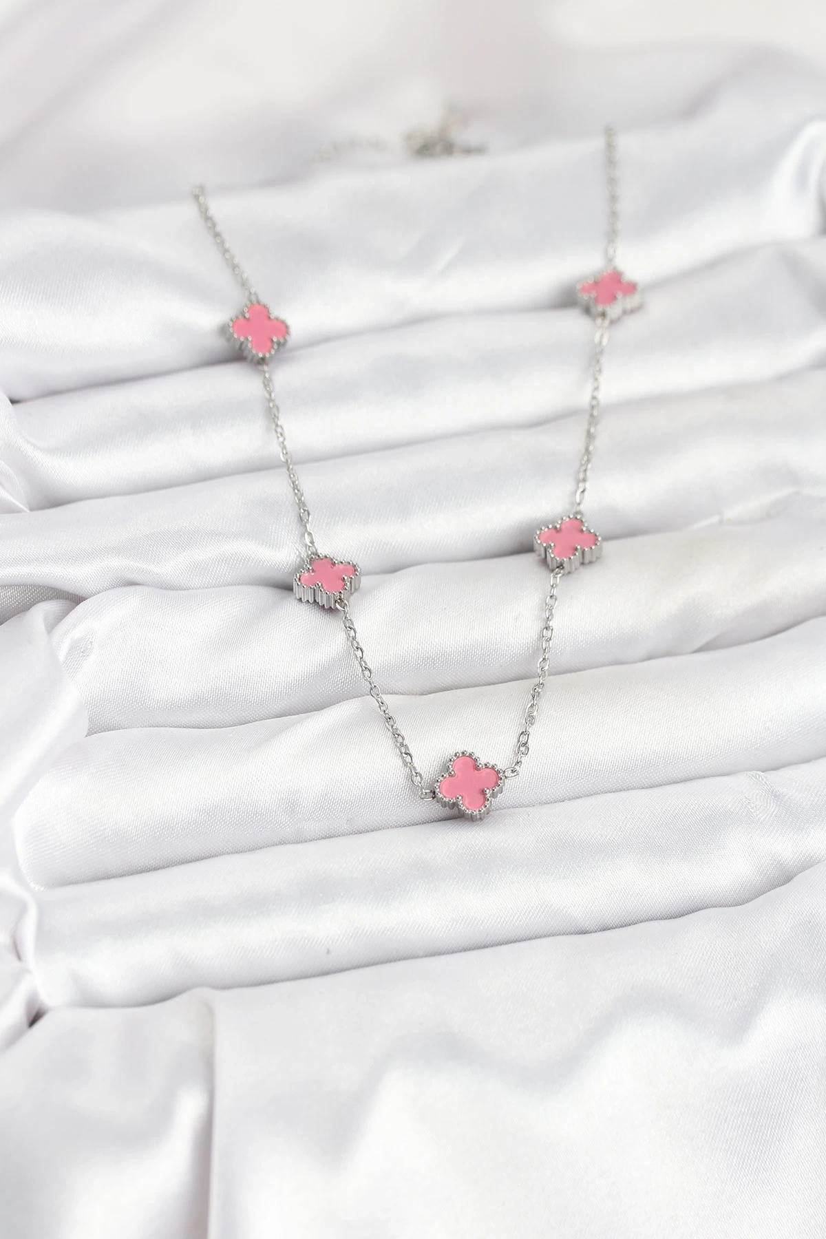316L Çelik Zincir Gümüş Renk Pembe Baby Boy Yonca Kadın Kolye