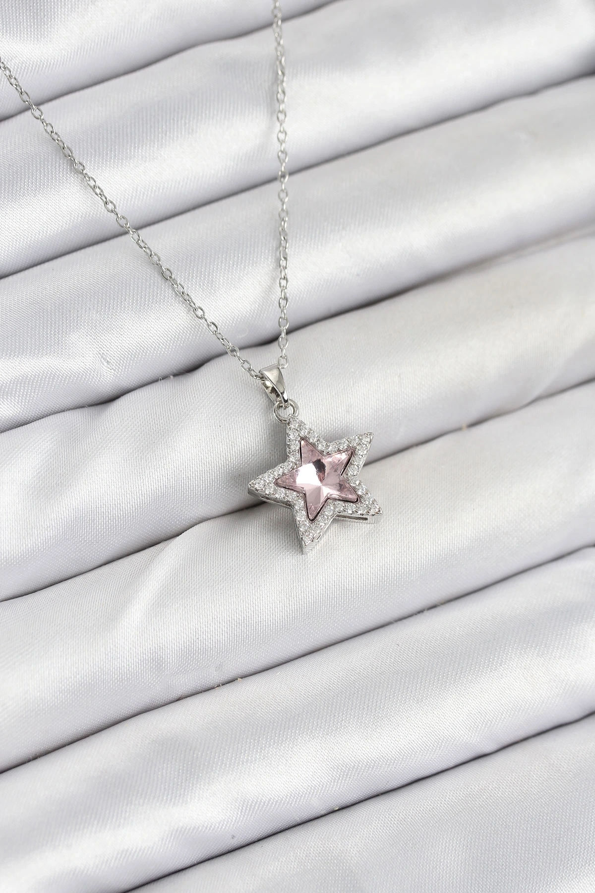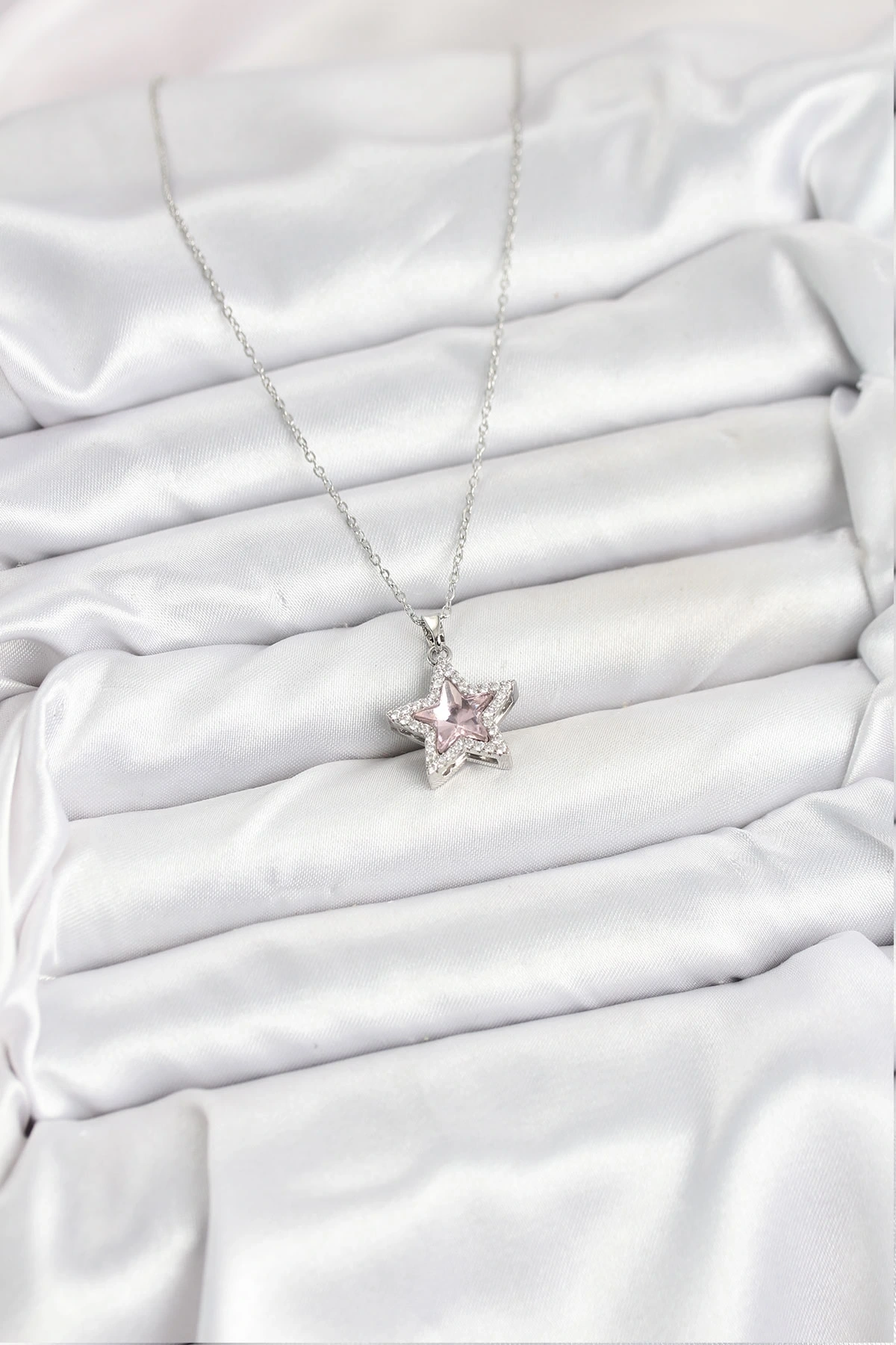 316L Çelik Zincir Gümüş Renk Pembe Taşlı Yıldız Model Kadın Kolye