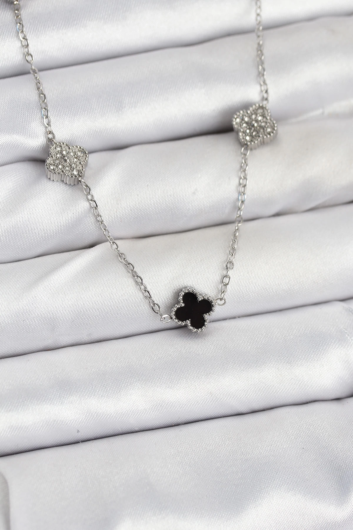 316L Çelik Zincir Gümüş Renk Siyah ve Zirkon Taşlı Baby Boy Yonca Kadın Kolye