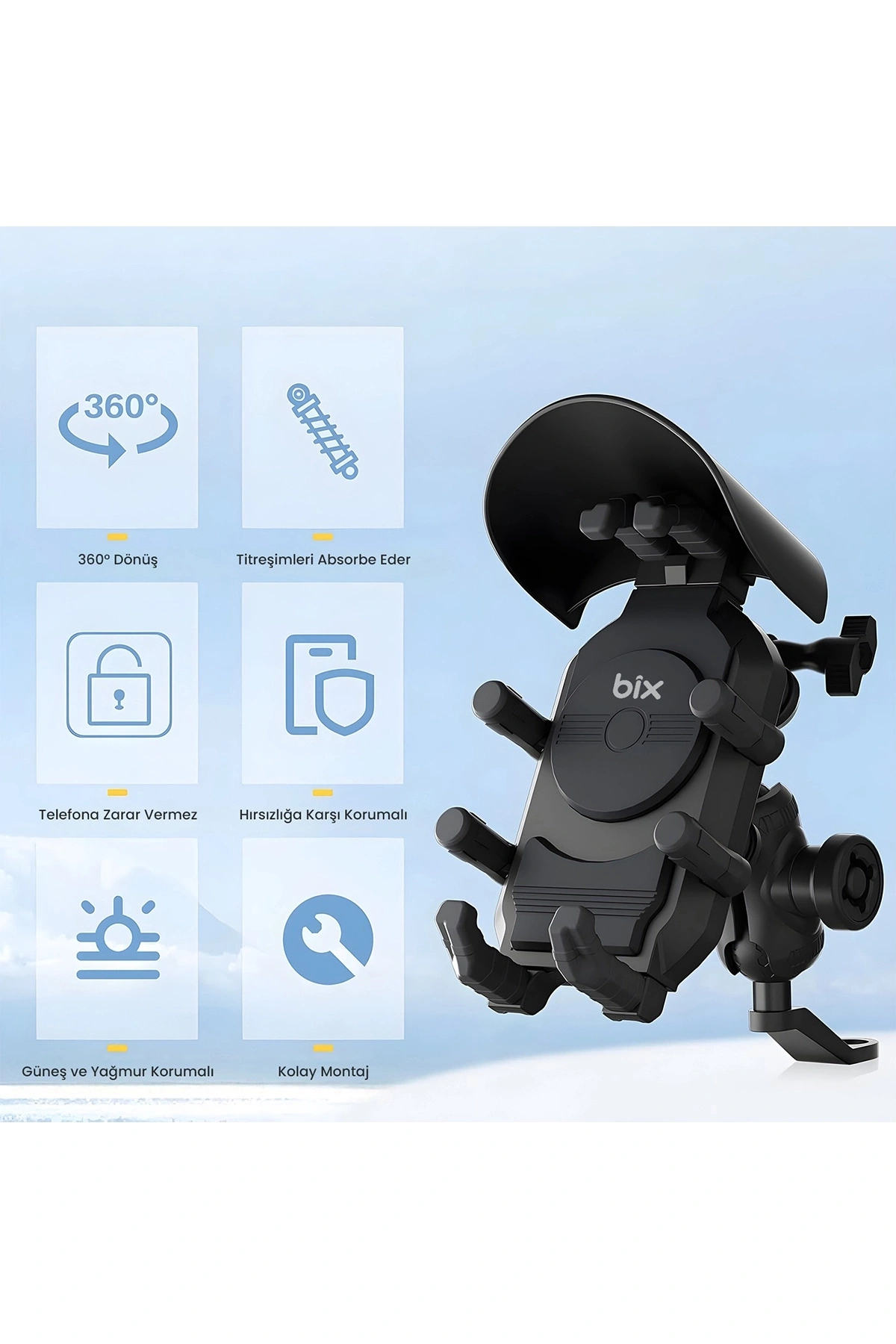 - Ayna Bağlantılı Güneş Ve Yağmur Korumalı 360° Derece Ayarlanabilir Motosiklet Telefon Tutucu