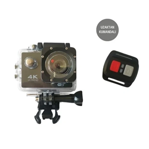 KUMANDALI 4K WI-FI AKSİYON KAMERASIÜrün ÖzellikleriKumandalı 4K Wi-Fi aksiyon kamerası, yüksek çözünürlüklü video ve fotoğraf çekimleriyle maceralarınızı ölümsüzleştirmek için tasarlanmıştır. 16 MP fotoğraf çözünürlüğü (4640x3480) ve 4K (3840x2160/30 fps) video kalitesi ile net ve canlı görüntüler elde edebilirsiniz. Geniş 170° açıya sahip lensi sayesinde her detayı yakalar. 30 metreye kadar su geçirmez kasası, dalış, yüzme ve yağmurlu hava çekimleri için mükemmel bir dayanıklılık sağlar. Kompakt boyutları (8,5x7x4 cm) ve 130 gr hafifliğiyle taşınması kolaydır. 900 mAh şarjlı Li-ion batarya ile yaklaşık 60 dakika kullanım süresi sunar ve ortalama 3 saatte tamamen şarj olur. Micro SDHC/SDXC kart desteği 64 GB’a kadar genişletilebilir depolama alanı sunar (kart dahil değildir). Micro HDMI ve micro USB bağlantı noktalarıyla veri aktarımı hızlı ve pratiktir. Wi-Fi özelliği sayesinde çekimlerinizi anında mobil cihazınıza aktarabilirsiniz.Paket İçeriği1 adet 4K Wi-Fi aksiyon kamerası1 adet uzaktan kumanda1 adet su geçirmez koruma kılıfı 1 adet USB şarj kablosu1 adet bağlantı aparatı seti