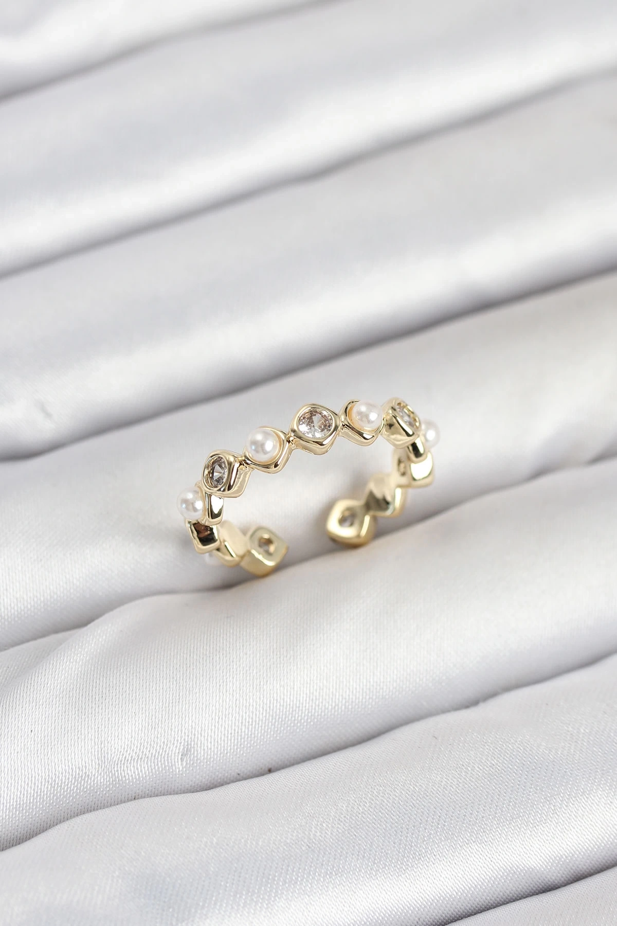 • Pirinç Gold Renk Zirkon Taşlı İncili Kadın Yüzük