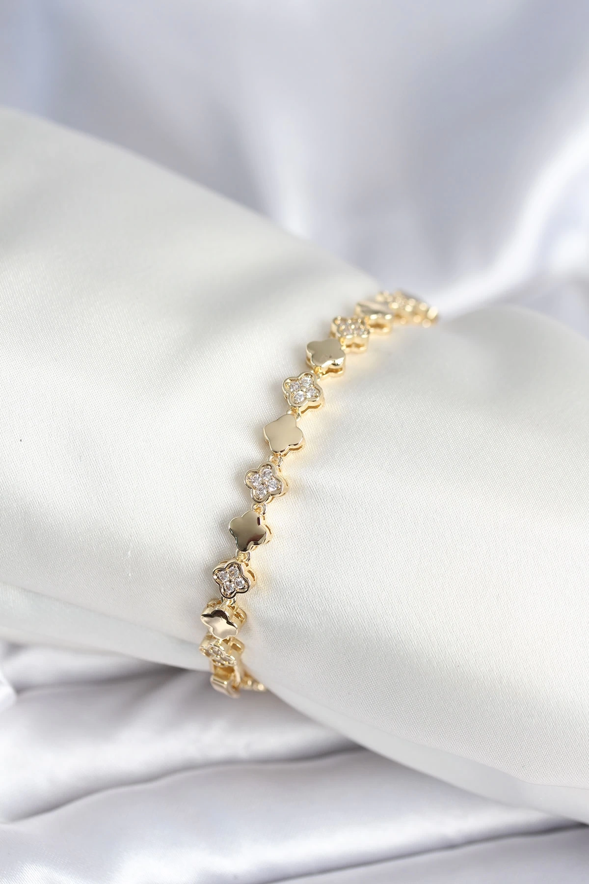 • Pirinç Gold Renk Zirkon Taşlı Yonca Model Kadın Bileklik