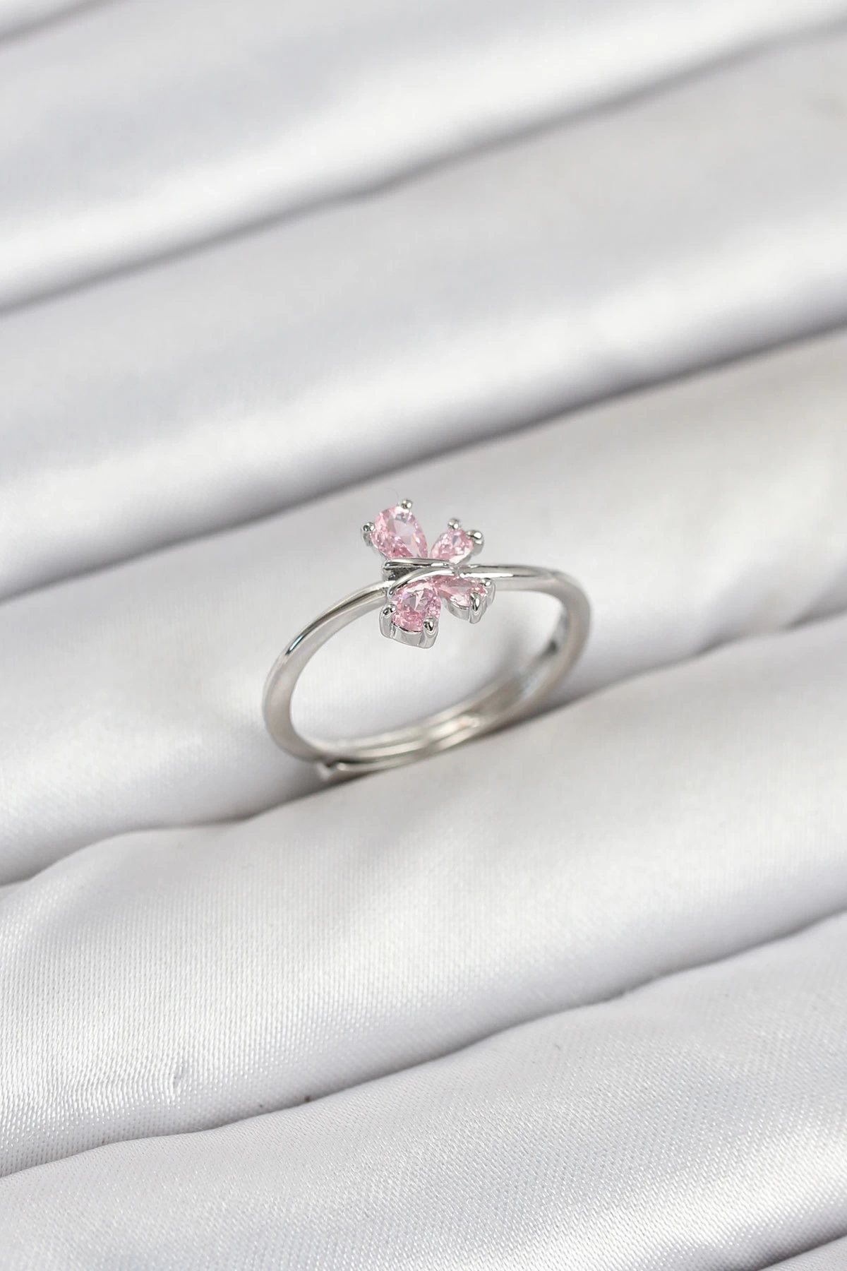 Pirinç Gümüş Renk Pembe Kelebek Kadın Yüzük