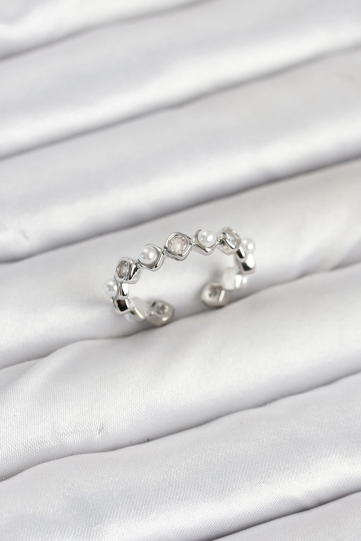 • Pirinç Gümüş Renk Zirkon Taşlı İncili Kadın Yüzük
