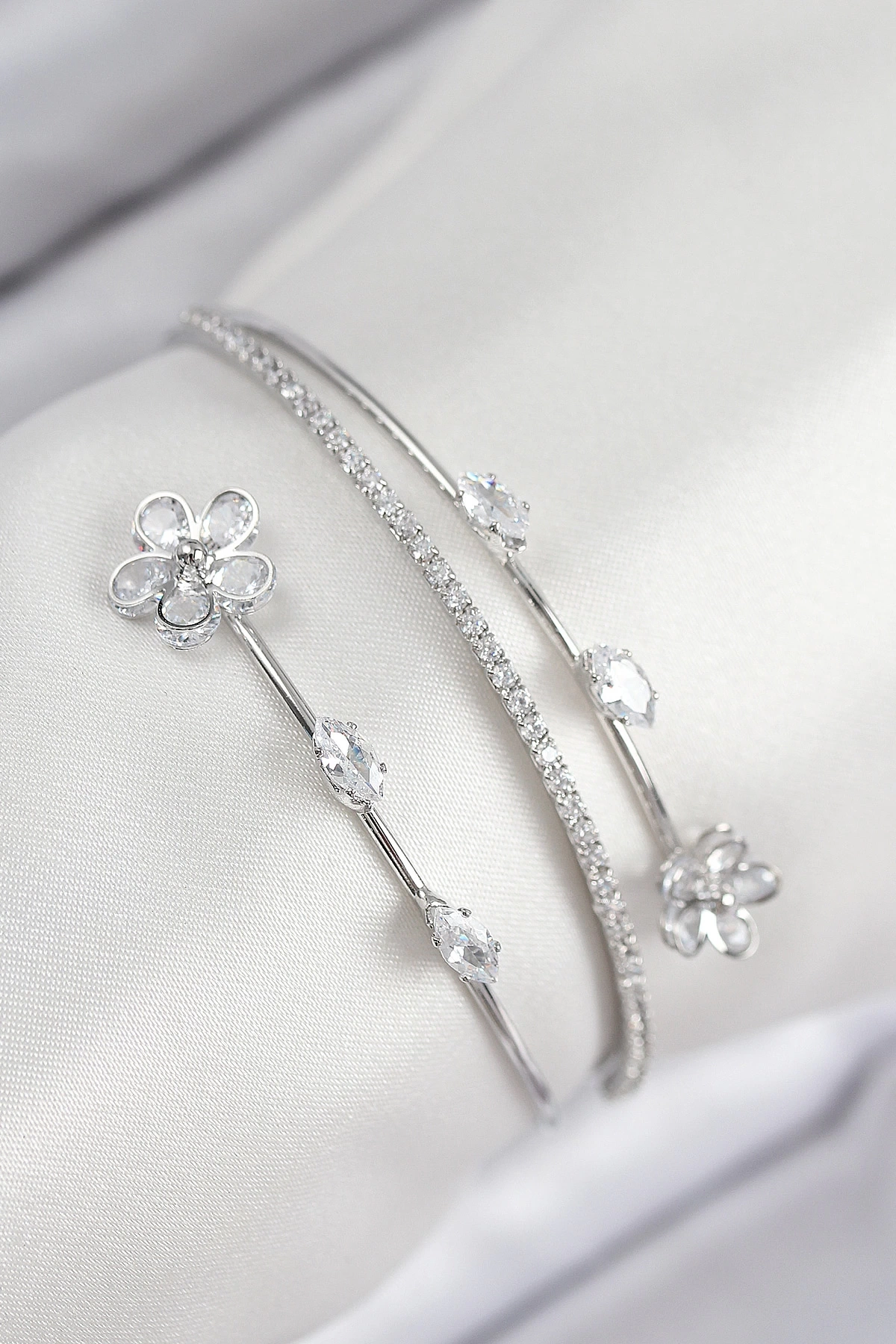 • Pirinç Zirkon Taşlı Çiçek Model Gümüş Renk Kadın Bileklik