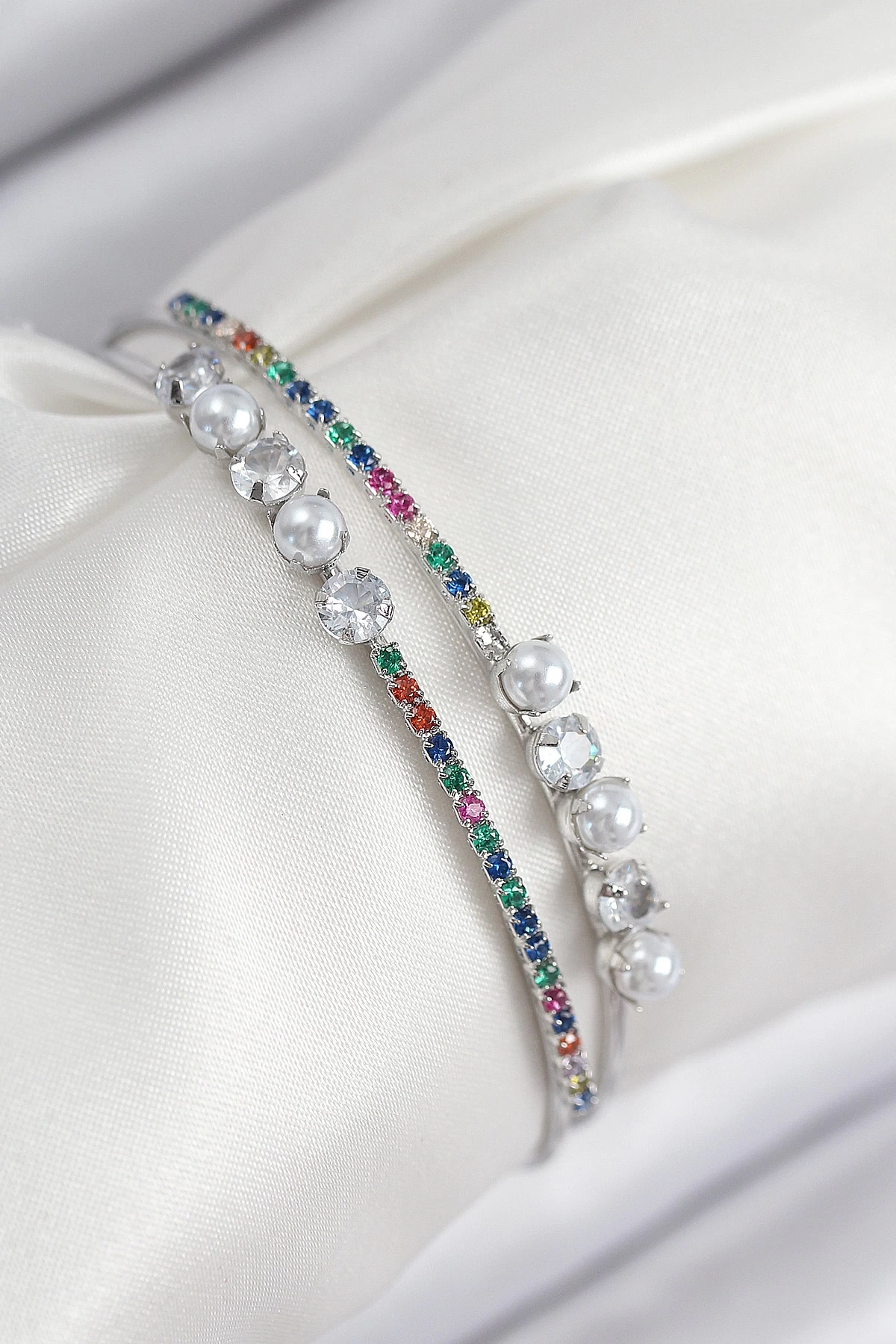 • Pirinç Zirkon Taşlı İnci Model Gümüş Renk Kadın Bileklik