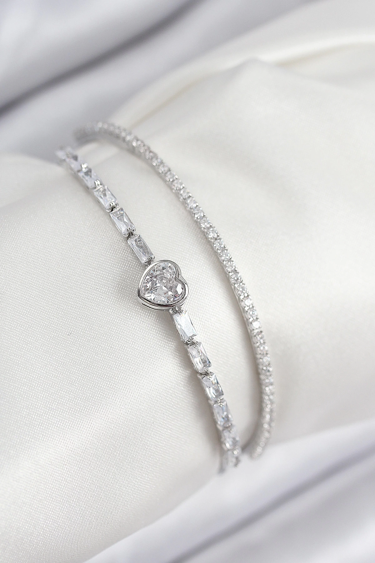 • Pirinç Zirkon Taşlı Kalp Model Gümüş Renk Kadın Bileklik