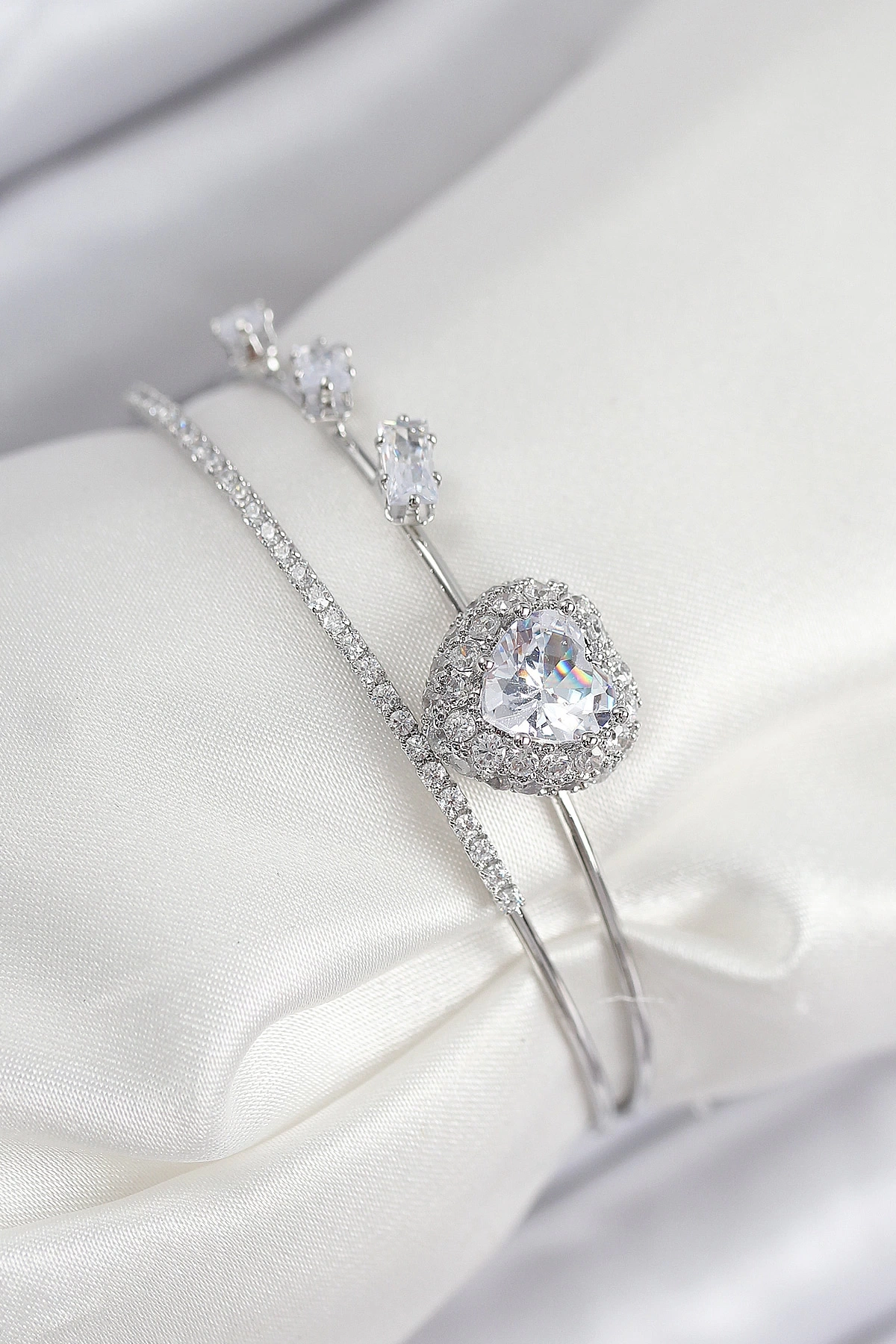 • Pirinç Zirkon Taşlı Kalp Model Gümüş Renk Kadın Bileklik
