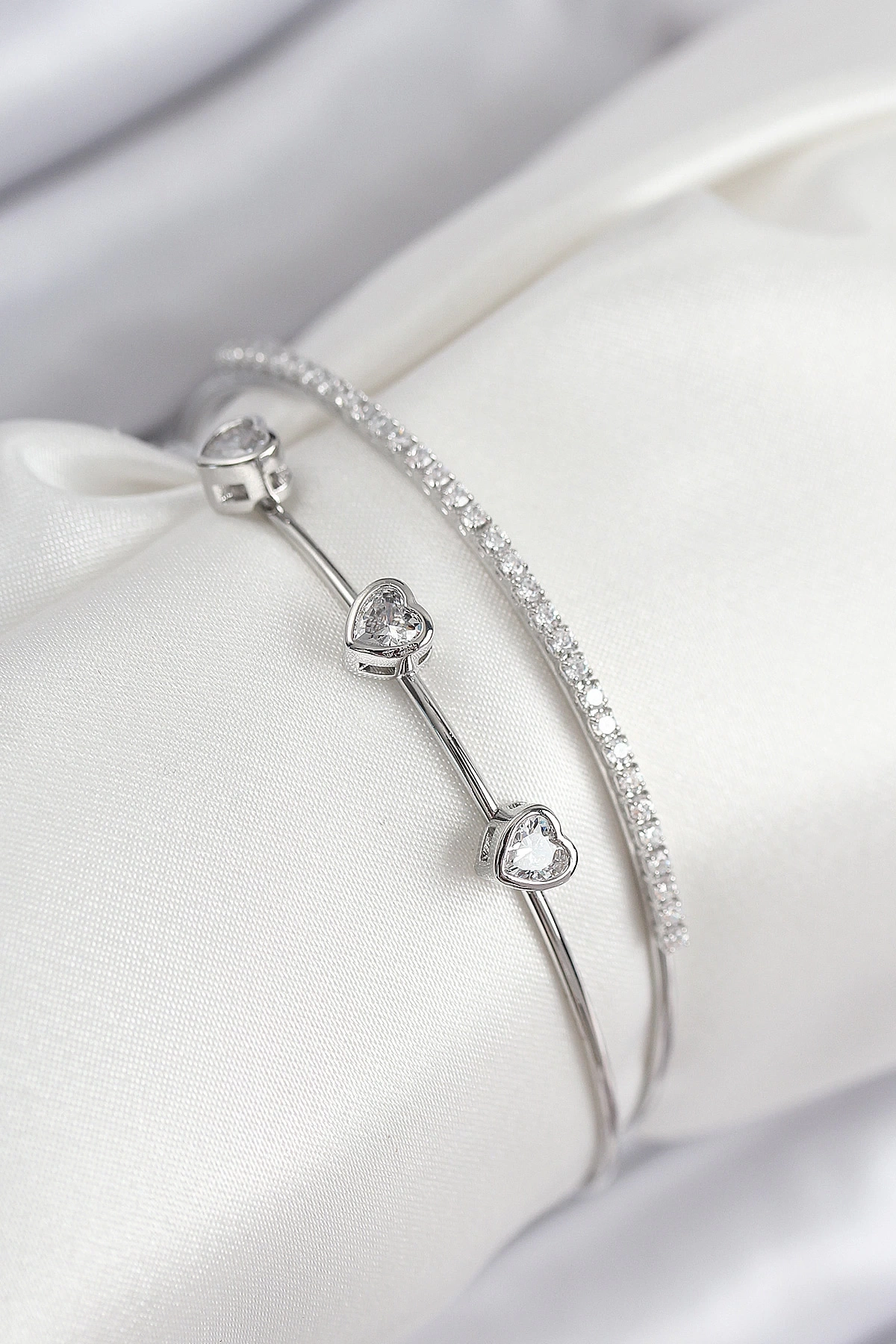 • Pirinç Zirkon Taşlı Kalp Model Gümüş Renk Kadın Bileklik