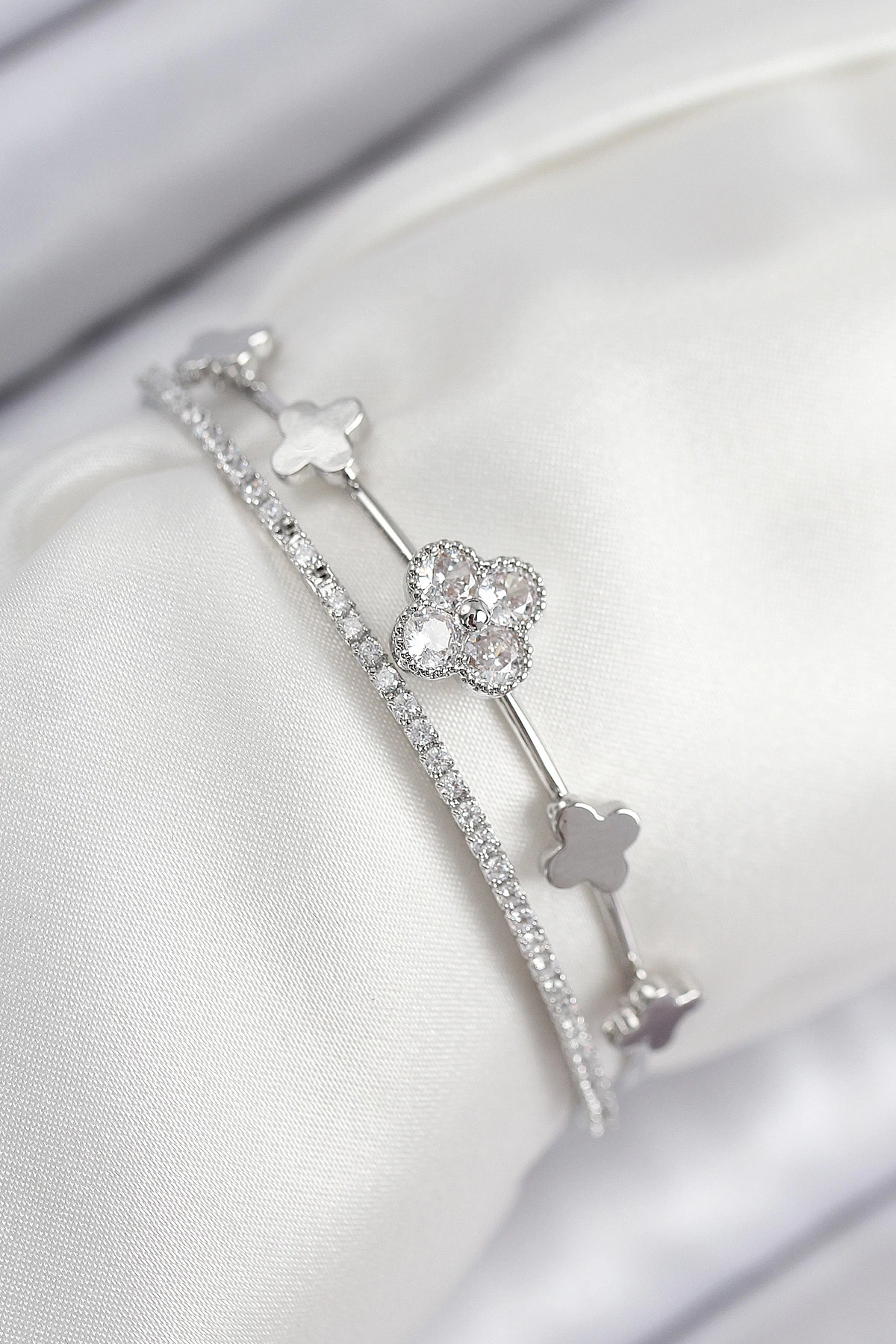 • Pirinç Zirkon Taşlı Yonca Model Gümüş Renk Kadın Bileklik
