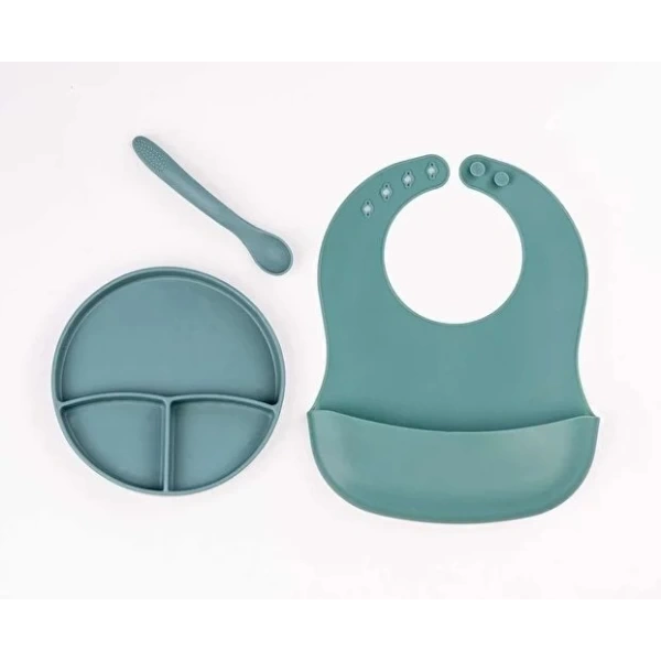 YEŞİL 3’LÜ SİLİKON YEMEK SETİ – ÖNLÜK + DİŞ KAŞIYICILI KAŞIK + VAKUMLU TABAKÜrün ÖzellikleriYeşil 3’lü silikon yemek seti, bebeklerin güvenli ve eğlenceli yemek saatleri için özel olarak tasarlanmıştır. Kaymaz tabanlı vakumlu tabak, yere düşmeden masada sabit durur ve 3 bölmeli tasarımı sayesinde yiyecekleri ayırarak sunmayı kolaylaştırır. Yumuşak uçlu silikon kaşık diş kaşıyıcı özelliğiyle bebeklerin hassas diş etlerine zarar vermeden kullanılabilir. Ayarlanabilir mama önlüğü ise 4 farklı boy seçeneği ve çift kilit sistemi sayesinde bebeğinizin hareketliliğine uyum sağlar, geniş haznesiyle dökülen yiyecekleri toplar ve etrafın kirlenmesini önler. %100 güvenli ve sağlıklı silikon malzemeden üretilmiş olan bu set, lateks içermez, alerji riski taşımaz ve düşük ısı iletkenliği sayesinde güvenli kullanım sunar. Dayanıklı ve esnek yapısıyla uzun süre kullanılabilir, renkleri solmaz ve hem elde hem de bulaşık makinesinde kolayca temizlenebilir.Paket İçeriği1 adet vakumlu 3 bölmeli tabak1 adet diş kaşıyıcılı silikon kaşık1 adet ayarlanabilir silikon mama önlüğü